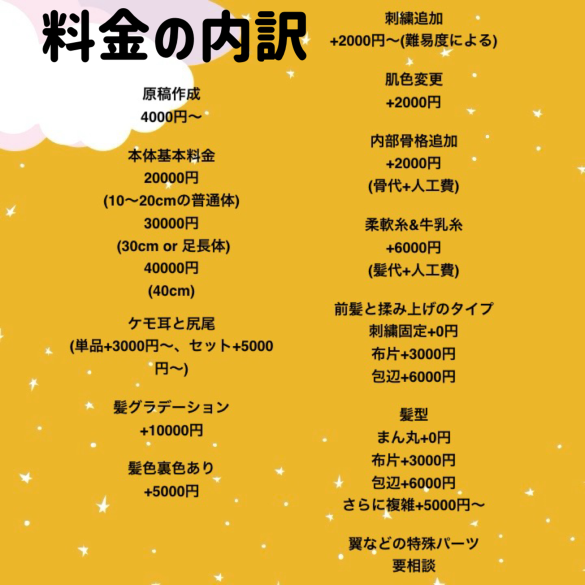 お支払い(原稿平均最小費用4000円、本体作成平均最小費用20000円(20cm以下の場合のお値段、その他は大きさや体型によっても異なります)
